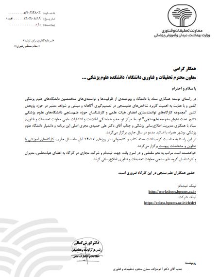 مجموعه کارگاه‎های توانمندسازی اعضای هیات علمی و کارشناسان حوزه علم سنجی دانشگاه‌های علوم پزشکی کشور تحت عنوان "مدرسه علم‌سنجی" در روزهای 27-24 آبان ماه 1404 از سوی مرکز توسعه و هماهنگی اطلاعات و انتشارات علمی معاونت تحقیقات و فناوری ستاد برگزار می‌گردد. اطلاعات کامل در پیوست زیر قایل مشاهده است.