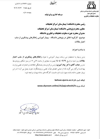 به استحضار می‌رساند وبینار آموزشی راهکارهای پیشگیری از سلب اعتبار مجلات در تاریخ شنبه 29 آذر به صورت مجازی و در بستر اسکای رود از ساعت 9 الی 12 برگزار می‌گردد. مدرس این وبینار جناب آقای دکتر پیام کبیری رئیس مرکز توسعه و هماهنگی اطلاعات و انتشارات وزارت بهداشت می‌باشد.